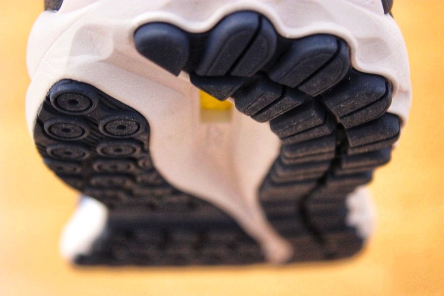 Das Gummi der Außensohle ist griffig und macht einen langlebigen Eindruck. Auf der lateralen Seite hat die Sohle längliche Elemente, während sie auf der medialen Seite kleine Kreise hat. Keine Ahnung, welchen Nutzen dies hat. Beide Seiten sind durch eine Führungslinie getrennt. Auf Asphalt ist der Grip gut. Dafür ist sie auch hauptsächlich gemacht. Bei Regen ist der Grip jedoch deutlich schlechter. Ich rutschte in der Abdruckphase öfter mal ein wenig weg. Drei Kerben im Vorfußbereich sorgen für die nötige Flexibilität.