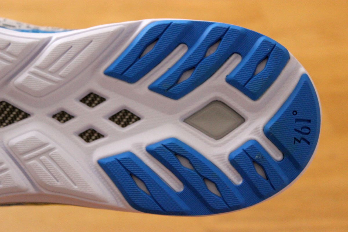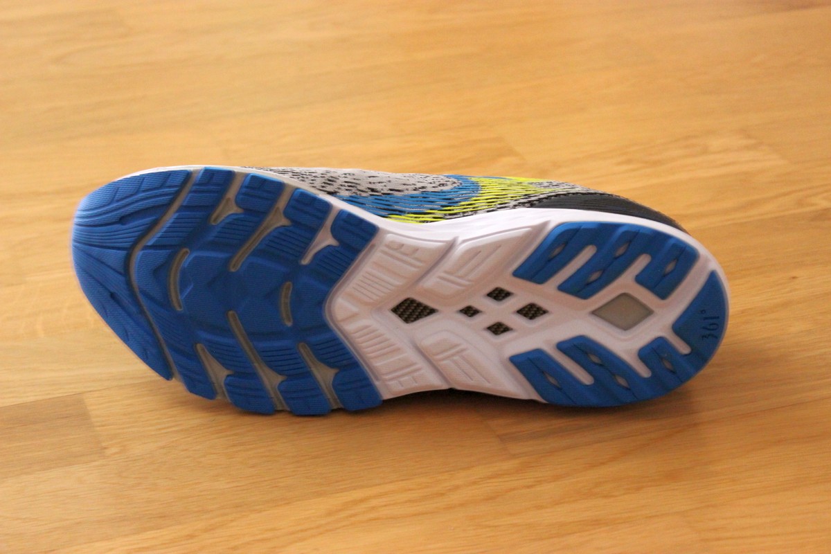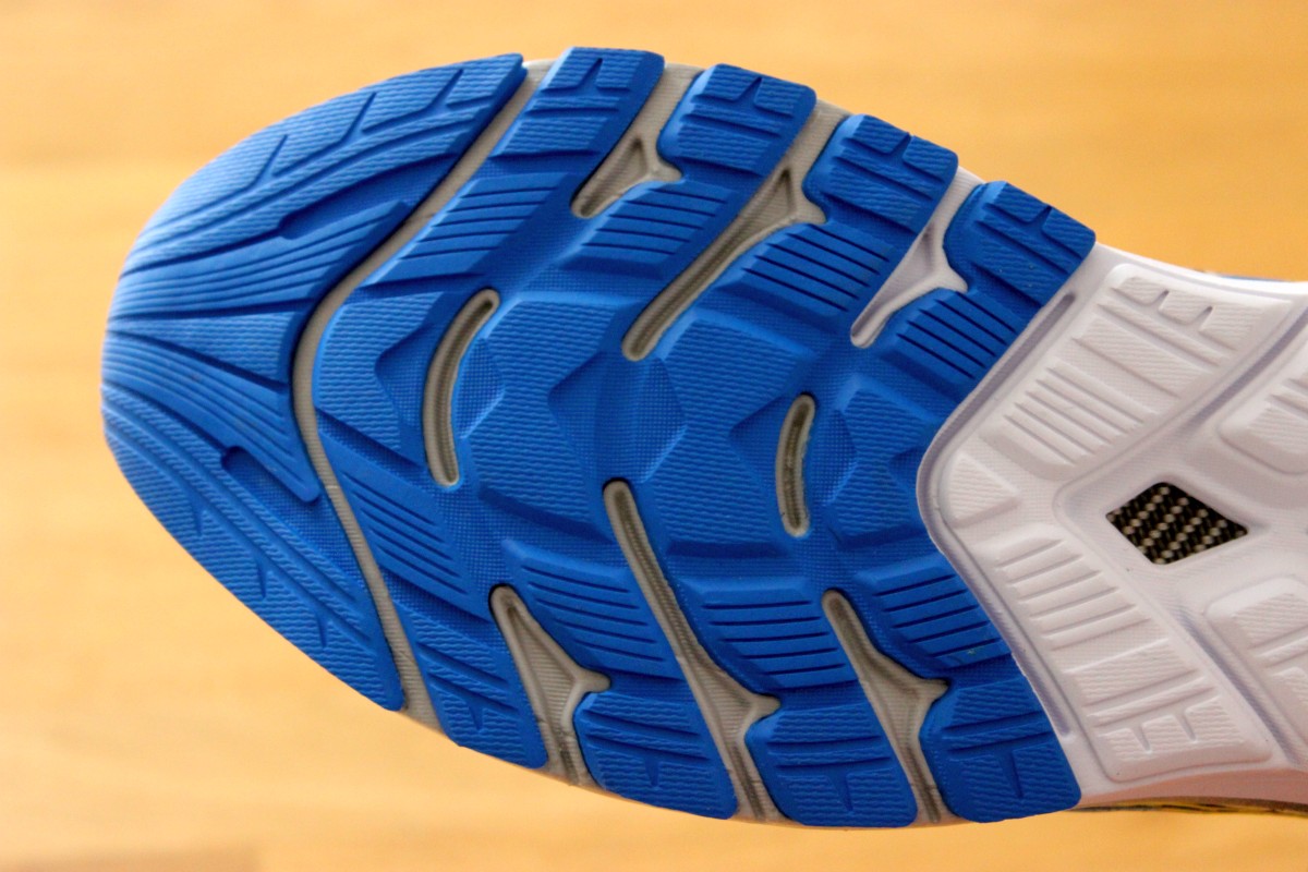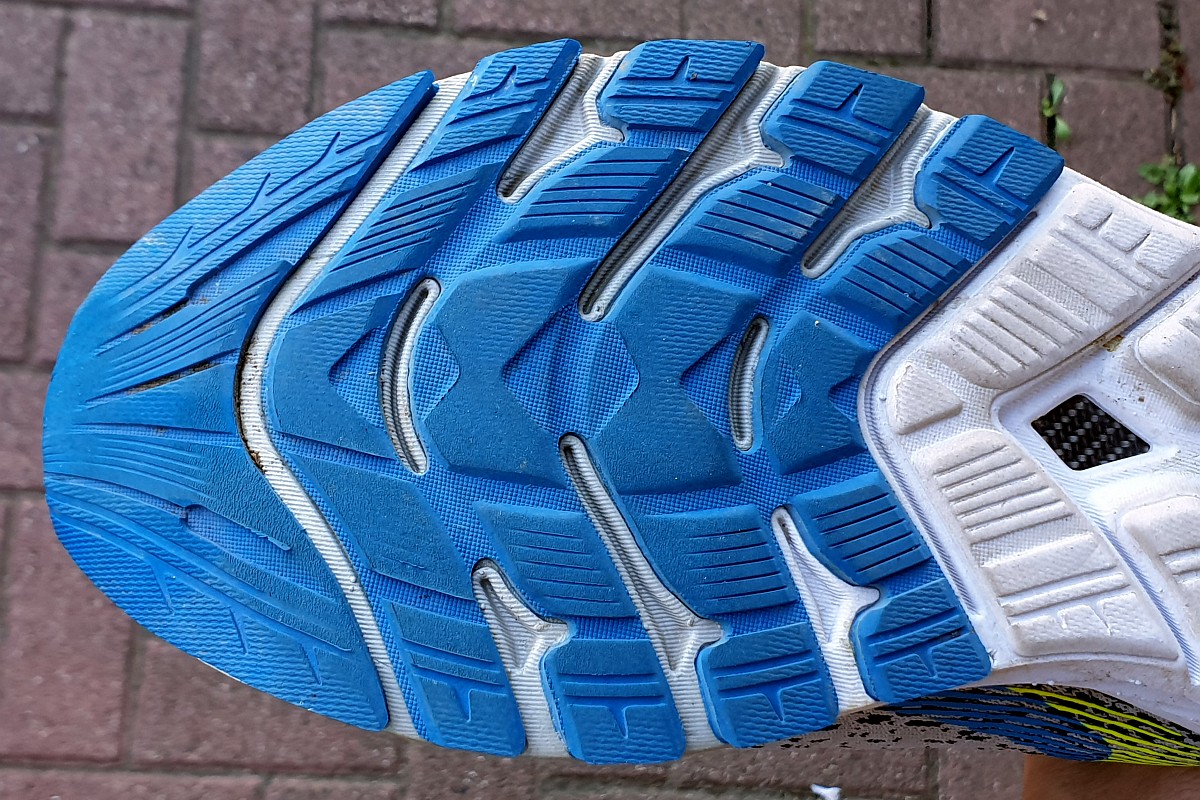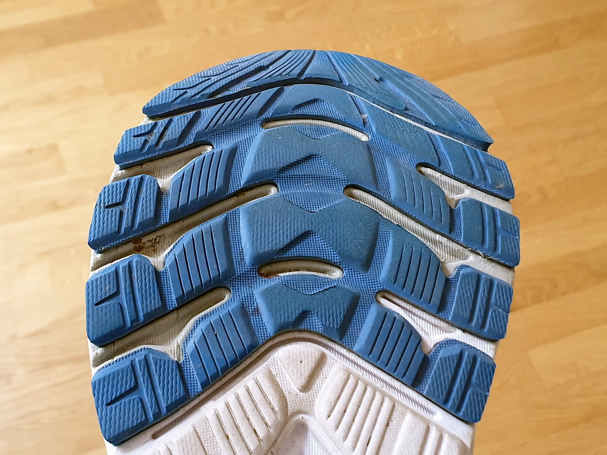 Die Außensohle ist in erster Linie für die Straße ausgelegt, aber auch Wald-, Feld- und Schotterwege lassen sich damit gut laufen. Die Gummimischung kommt mir jedoch etwas weich vor und ich habe bereits nach 100 Kilometern deutlich Abrieb an Stellen, die beim Abdruck beansprucht werden. Der Grip bei Regen ist ausreichend, könnte aber noch etwas besser sein.