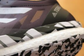 Aufgrund des dünnen Obermaterials war ich zunächst skeptisch, wie gut der Halt im Schuh sein würde. Doch die Skepsis war weitestgehend unbegründet. Zumindest was das Obermaterial betrifft. Dies konnte bzgl. Halt weitestgehend überzeugen. Am Hang oder in Kurven ist der Seitenhalt vorne nicht voll gegeben. Etwas wackelig empfand ich manchmal auch den Fersenbereich mit der weichen Boost-Dämpfung. Da hatte ich das Gefühl, dass das Boost-Material gelegentlich seitlich etwas nachgab und nicht ganz so stabil war (siehe Video unten). Der Fersenbereich ist zudem auch sehr minimal gehalten. Eine Verstärkung gibt es nicht. Ob diese leichte Instabilität vom Boost-Material oder vom dünnen Fersenbereich kam, lässt sich schwer sagen. Es war auch nicht immer der Fall. Beim Downhill musste ich konzentriert bleiben, da ich schnell zum seitlichen Wegknicken neigte, wenn ich etwas auf dem Boden übersah.